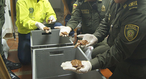 Nuestros Profesionales de Policía adscritos a la especialidad de Policía Ambiental y la Seccional de Investigación Criminal SIJIN, capturaron a un sujeto de 23 años de edad, a quien le fueron hallados en su poder 212 tortugas de la especie "mata-mata", las cuales estaban empacadas en rusticas cajas dentro de bolsas de plástico con agua.La oportuna información suministrada por la comunidad, permitió ubicar este hombre en momentos en que llevaba el cargamento de fauna silvestre extraída ilícitamente, para ser enviado en la modalidad de encomienda al interior del país. Este tipo de tortugas propias de la Amazonía se comercializan para ser utilizadas como ornamento de acuarios, en un mercado criminal que atenta contra el equilibrio ecológico de èsta región del planeta.Los frágiles anfibios eran transportados en condiciones muy precarias, la inspección realizada por los biólogos y profesionales veterinarios de CORPOAMAZONIA, permite inferir que el 50% de las tortugas hubieran resistido el tortuoso viaje.El individuo capturado fue puesto a disposición de la autoridad competente por el delito de aprovechamiento ilícito de los recursos naturales, entre tanto que las tortugas están siendo tratadas por los Personal experto de COROPOAMAZONIA, con el fin de evaluar su condición y adelantar el su procesos de retorno al hábitat natural.