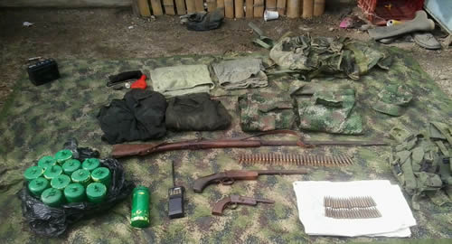 Luego de un trabajo investigativo adelantado por la Policía Nacional y a datos suministrados por integrantes de la Red de Apoyo, se pudo establecer que dentro de un inmueble al parecer escondían artefactos explosivos, municiones y material de intendencia, por lo que los investigadores coordinaron el procedimiento con la Fiscalía General de la Nación y el acompañamiento del Ejército Nacional.En la diligencia de registro y allanamiento realizado a una vivienda ubicada en la vereda Monguí del municipio de Gramalote se logró ubicar EN varios costales que estaban enterrados en el patio de la casa 14 minas antipersona, un radio escáner de comunicaciones, munición para fusil 5.56, tres armas de fuego junto con uniformes de uso privativo de las fuerzas militares y abundante material de intendencia. Según las investigaciones, estos elementos son elaborados de forma muy rudimentaria y artesanal por los integrantes de la compañía Comandante Diego del ELN y tienen como fin atentar en contra de integrantes de la Fuerza Pública que diariamente adelantan operativos de registro y control en la zona y que en los últimos días ha proporcionado golpes contundentes contra el narcotráfico en varios municipios del Departamento, además ponen en riesgo la integridad de los Nortesantandereanos. Este procedimiento se dio en el marco de la "Operación Fortaleza", adelantada por unidades adscritas a las Seccionales de Investigación Criminal y de Inteligencia policial con el apoyo incondicional de las tropas del Ejército.