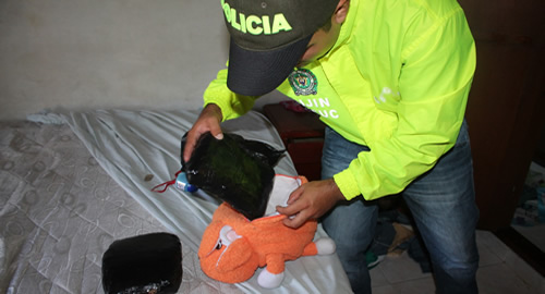 Efectivos del grupo de estupefacientes de la Seccional de Investigación Criminal (Sijín) llegaron hasta el sector Prados del Norte, donde hallaron la sustancia estupefaciente camuflada en diferentes partes de una vivienda y osos de peluches. Durante el registro a la vivienda que sería un centro de empaque, dosificación y distribución de la sustancia ilícita, los investigadores encontraron varios paquetes del alucinógeno empacados en material plástico, los cuales estaban distribuidos en varias partes de un closet de una de las habitaciones y escondidos al interior de dos muñecos de peluche.Asimismo fueron hallados cuatro chalecos de una entidad aduanera nacional y una chaqueta de una empresa de telefonía y servicios de internet de cobertura nacional. Al parecer los artículos serían utilizados para suplantar a funcionarios y evitar ser descubiertos por las autoridades.Los elementos incautados fueron dejados a disposición de la fiscalía.