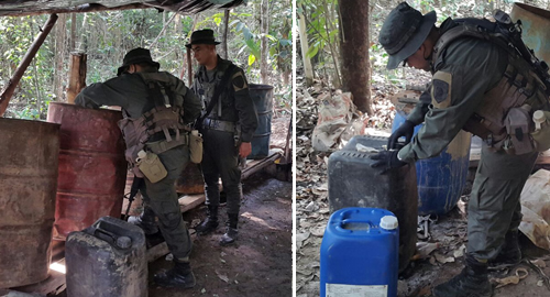 La Policía Nacional a través de la Metropolitana de Cúcuta con el apoyo del Escuadrón Móvil de Carabineros sigue atacando el narcotráfico con epicentro en la zona de frontera, esta vez logrando la destrucción de un laboratorio artesanal para el procesamiento de la hoja de la mata de coca, que funcionaba en zona rural del Municipio de Puerto Santander.Es así como en desarrollo de labores de patrullaje y control, los uniformados llegaron hasta un terreno enclavado en la zona montañosa, distante a aproximadamente hora y media a pie desde el casco urbano del corregimiento vigilancia por la vía destapada que conduce al municipio de Tibú.En medio de la espesa vegetación fue descubierto una construcción en techo de plástico, cimientos en madera y polisombra, en el cual se llevaba al parecer el procesamiento de la hoja extraída de la mata de coca. En el lugar se hallaron varias canecas metálicas donde habían almacenados 115 galones de gasolina y diez galones de amoníaco, líquidos que son utilizados como insumo para la producción de la base de coca.Igualmente, dos contenedores con aproximadamente 110 galones de una sustancia líquida color amarillo con partículas blancas y características similares a la coca en proceso de producción. A este líquido le fue aplicada la Prueba de Identificación Preliminar Homologada (PIPH) la cual arrojó positivo para cocaína y sus derivados.De las sustancias encontradas se tomaron las respectivas muestras que fueron dejadas a disposición de la autoridad judicial competente. Entre tanto, la construcción y los demás remanentes de los insumos químicos descubiertos, fueron destruidos de forma controlada por los uniformados.