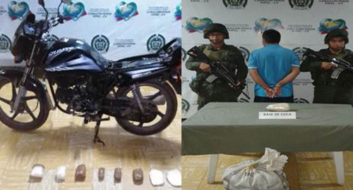 En desarrollo de operativos contra el micro tráfico, la Policía Nacional logra la captura de un hombre de 27 años de edad y la incautación de un kilo y novecientos seis gramos de base de coca que posiblemente serian comercializados en esta localidad.Personal de la Compañía Antinarcóticos de operaciones Florencia desarrollo dos operativos de control que arrojo este importante resultado, el primer operativo en la vía que de La Montañita conduce a Florencia, gracias a la destreza y conocimiento de los uniformados logran la captura de un hombre de 27 años de edad, quien se movilizaba como ayudante de un vehículo tipo mixto de servicio público al momento de registrar sus pertenencias se le halló camuflado al interior de un costal un paquete de base de coca mezclado con limones que arrojo un peso neto de (726) gramos avaluados en $1.452.000.El segundo operativo una persona al notar la presencia y el control de la Policía dejo abandonada una motocicleta que al ser inspeccionada se le halló camuflados en el sillín, el filtro de aire y el compartimiento de herramientas 8 paquetes que en su interior contenían un kilo y ciento ochenta gramos de base de coca avaluada en $2.360.000.El capturado y la sustancia incautada fueron dejadas a disposición de la fiscalía de turno URI, por el delito de Tráfico, fabricación o porte de estupefacientes (Artículo 376 del Código Penal).