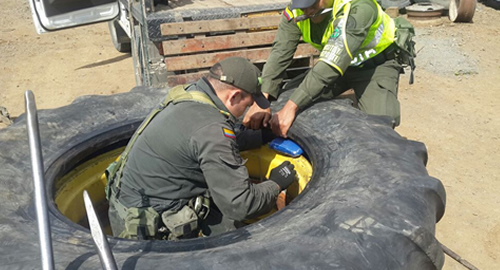 Policías que integran la Seccional de Tránsito y Transporte del Departamento de Policía Valle del Cauca en desarrollo de las actividades desplegadas en el marco del plan de choque, "Vamos Seguros" contra el narcotráfico, lograron identificar un vehículo tipo camioneta de estacas en la cual eran transportadas dos llantas para tractor y dentro de estas camuflada la sustancia tipo marihuana envueltas por paquetes en cinta en paquetes.El vehículo que presuntamente había salido del municipio de Guacari, fue interceptado por las unidades policiales en el peaje de Toro quienes al observar de manera sospechosa que dicho automotor iba con sobrepeso, aspecto que pudieron identificar al percatarse que la carrocería del vehículo venia más pegada de lo normal a la superficie y que los amortiguadores estaban más contraídos por el peso de la carga.Es de esta forma que detienen el automotor e inspeccionan las llantas, las cuales ya venían con los rines listas para colocar, al quitar la válvula del aire inmediatamente detectan el olor a marihuana que estas emanaban por lo cual dispusieron a realizar un registro más exhaustivo.Dentro del procedimiento fue capturado un hombre de 43 años de edad, conductor del vehículo quien le manifestó a los uniformados al momento de ser detenido para inspeccionar el vehículo que se dirigía a reparar un tractor que requería las llantas por la vía entre Ansermanuevo y La Virginia.El vehículo en el que se transportaba la sustancia estupefaciente al igual que el conductor del automotor fueron puestos a disposición de la Fiscalía del municipio de La Unión, por el delito de porte tráfico y fabricación de estupefacientes.