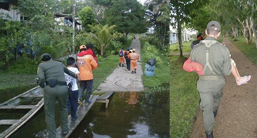 Las Tres niñas de 13, 9 y 8 años de edad y un niño de 10 años de edad, fueron rescatados luego durar perdidos en las salvajes selvas del Amazonas por más de 24 horas. Los hechos se registraron en la comunidad de Mocaua, jurisdicción del municipio de Puerto Nariño, cuando los cuatro pequeños salieron a bordo de dos canoas, sin autorización de sus padres a recolectar frutos y a bañarse en un caño afluente del río Amazonas, con el transcurso de las horas el padre de las niñas preocupado por la ausencia, informó a nuestros uniformados donde se coordinó inicialmente con la guardia indígena, una búsqueda en inmediaciones de la localidad, la cual resultó no daba un resultados positivo. Con el llegar de la noche la situación se tornó más preocupante y a la incesante búsqueda se sumaron lugareños, pescadores, y miembros de la Defensa Civil y La Armada Nacional con su equipo de navíos, lo cual permitía cubrir un mayor área de búsqueda incluso con iluminación.  Nuestros uniformados del Grupo de Infancia y Adolescencia buscaron con un indígena pescador en algunos caños y recodos del rio Amazonas que por ésta época del año está inundada a más de 13 metros de altura del nivel normal, donde fueron hallados los niños quienes fueron arrastrados por las aguas al naufragar en sus canoas. Valientemente la niña de 13 años se las había arreglado para mantener a flote los otros tres pequeños utilizando gigantescas hojas como "colchones flotantes", mientras que ella soportó la noche entera con el agua a la cintura, en la penumbra de la selva y a merced de los elementos naturales, reptiles, insectos y fieras que durante toda la oscura y larga noche los atemorizaron. Luego de más de 25 horas de desesperada búsqueda los niños fueron rescatados y trasladados al hospital local, donde les diagnosticaron hipotermia, pánico y algo de deshidratación; sin embargo luego de ser atendidos y examinados y al registrar niveles seguros de salud y recuperación, fueron regresados el seno de su hogar, para felicidad de sus progenitores y provincianos.