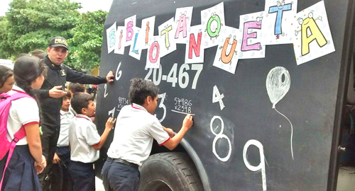 Siempre que pensamos en el grupo móvil de anti disturbios ESMAD, lo relacionamos de forma directa con las armaduras negras, gases lacrimógenos y la tanqueta que caracteriza la fuerza de un grupo de choque. Pero este no es el caso para el subintendente Barrera, quien en medio de su difícil tarea de controlar todo tipo de disturbios, ha sacado un tiempo para cambiar percepción del grupo de choque y ha diversificado las funciones de una tanqueta que se convirtió en un símbolo multipropósito en toda el área metropolitana de Cúcuta.Para este subintendente, la idea de cambiar el concepto de fuerza por el de amistad le ha tomado algo más de tres años, donde por medio de actividades pedagógicas y en compañía de su equipo de trabajo, ha realizado cientos de actividades donde vincula a la población infantil por medio de la pedagogía y el arte, es así, que ha trasformado la gigantesca tanqueta Negra en una Biblio-tanqueta, llena de libros, colores y crayolas, en la cual recorre algunos barrios críticos de la ciudad, llevando alegría a miles de niños a través de cuentos y un amplio material multimedia.Pero la idea de volverla una biblioteca rodante no fue suficiente para barrera, y este joven de treinta y dos años, nacido y criado en el barrio la concordia, decidió que la música y el ritmo debían hacer parte del acercamiento comunitario, y con ayuda de una fundación de bailarines formaron un espectáculo de bailes donde más de 15 patrulleros vestidos con la armadura negra y al ritmo del ROCK, enviaban un mensaje de paz y convivencia, el cual por su característica se volvió viral en las redes sociales y logró llevar este evento a diferentes colegios, llenando inclusive un auditorio de más de tres mil estudiantes. Al ESMAD de Cúcuta, es fácil verlo, favoreciendo a los más necesitados, almorzando con personas en estado de vulnerabilidad, o realizando actividades con niños por toda la ciudad y el toque principal puesto por barrera es la versatilidad que la tanqueta le impregna a cada una de las actividades, donde en su última intervención la vimos convertida Papa Noel- Tanqueta que en compañía de la emisora 88.7 prendió las fiestas navideñas de todos los hogares en la Perla del Norte.Este 2016 no sabremos que nuevas ideas tendrá Barrera y todo su equipo de trabajo, lo que si estamos seguros es los temas media ambientales estarán la orden del día y seguirá llevando educación y alegría a miles de niños en toda Cúcuta.