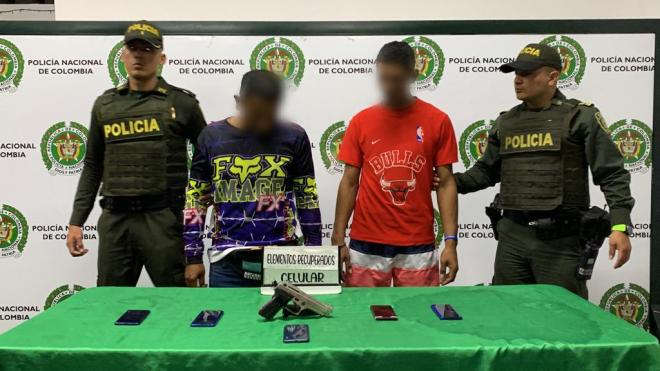 La oportuna denuncia ciudadana y la activación del plan candado permitieron la captura en flagrancia de dos hombres de nacionalidad extranjera, a quién les hallo en su poder cinco teléfonos celulares, los cuales habían sido hurtados a personas que transitaban por el sector de Girón.