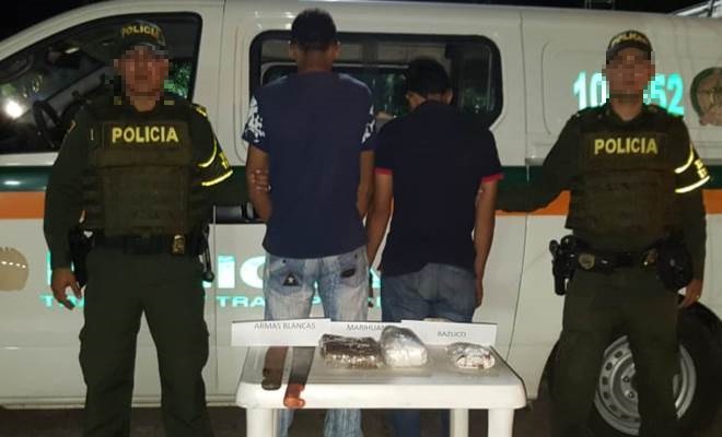 Mediante planes estratégicos encaminados al control de pasajeros y mercancías transportadas en diferentes modalidades, unidades de tránsito ubicadas en la vía Pueblo Nuevo, realizaron la captura de dos hombres de 21 y 25 años de edad, quienes viajaban como pasajeros de Valledupar a Bosconia. Al momento de solicitarles un registro a las personas se les encontró en el equipaje de mano 8000 gramos de marihuana, 597 gramos de bazuco y dos armas blancas tipo machete, por lo anterior se procede a realizar la judicialización de los ciudadanos, los cuales fueron dejados a disposición de la fiscalía URI de Valledupar donde deberán responder como presuntos responsables del delito de porte, tráfico y/o fabricación de estupefacientes.
