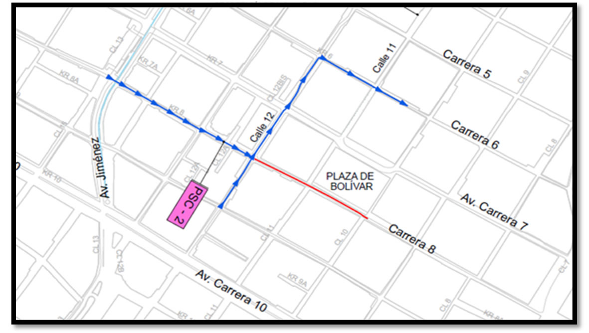 - Los usuarios que circulan en sentido Norte - Sur por la Carrera 8 deberán tomar la Calle 12 al Oriente - Carrera 6 al sur (Ver mapa 1).