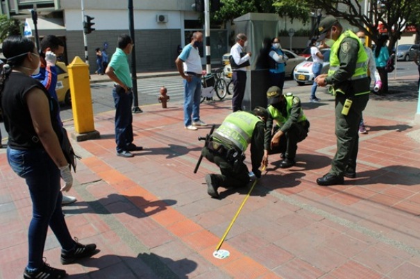 Seguidamente los uniformados ubicaron lugares de alta aglomeración de público, como bancos, almacenes y cajeros electrónicos, posteriormente tomaron distancia de 1.5 metros para adherir estas pegatinas en el suelo, dando un punto de referencia a las personas, al tiempo daban recomendaciones de bioseguridad a la comunidad y les explicaban que esta es la “Distancia de-vida”.