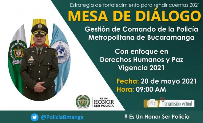 Nos complace en invitar a la Mesa De Diálogo sobre Gestión de Comando de la Policía Metropolitana de Bucaramanga con enfoque en Derechos Humanos y Paz a los integrantes de las juntas de acción comunal, gremios, redes de participación cívica, a los integrantes de las juntas de acción comunal, a las autoridades político administrativas, integrantes de veedurías ciudadanas, juntas administradoras locales, escuelas de seguridad, policía cívica de mayores, frentes de seguridad, a líderes o delegados de las poblaciones vulnerables, afrodescendientes, raizales y palanqueros, indígenas, comunidad LGTBI+, defensores de derechos humanos, ONGS, sindicalistas, trabajadoras sexuales, periodistas y comunidad en general que deseen participar acto que se realizará el día 20 de mayo del 2021, a partir de las 09:00 de la mañana de forma virtual, se pueden conectar a través de nuestro Facebook live en la cuenta Radio Policía Bucaramanga 91.7