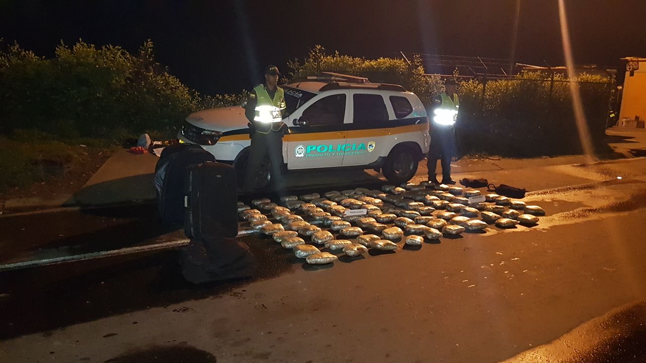 El otro caso se registró en ese mismo punto, donde los policiales detienen un bus de servicio público con la ruta Cali-Medellín, que al ser registrado, fueron halladas en la bodega tres maletas y dos maletines los cuales contenían 98 paquetes de marihuana para un total de 48.900 gramos del estupefaciente.