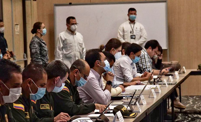 Desde #Pereira, en #ConsejoDeSeguridad liderado por el Sr. presidente @IvanDuque, junto a @Diego_Molano (@mindefensa), comandantes @FuerzasMilCol y autoridades regionales, verificamos el estado del orden público en #Caldas, #Quindío, #Risaralda y #ValleDelCauca.