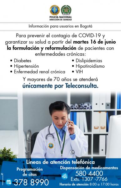 Prevenir el contagio de COVID-19 y velar por la salud de todos los usuarios del Subsistema de Salud de la Policía Nacional es nuestra responsabilidad, por eso la Dirección de Sanidad ha dispuesto que los pacientes con enfermedades crónicas, residentes en la ciudad de Bogotá D.C., realicen el trámite de formulación y reformulación de sus citas y medicamentos de forma telefónica.