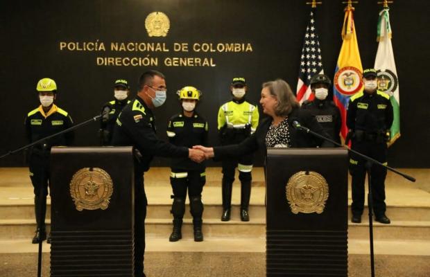 Bogotá D.C. La subsecretaria de Asuntos Políticos de Estados Unidos, Victoria Nuland, quien cumple una agenda en Colombia, se reunió con el director de la Policía Nacional, general Jorge Luis Vargas Valencia, en las instalaciones de la Dirección General en Bogotá, e hizo el anuncio del histórico apoyo al Proceso de Transformación Integral, que contribuye al fortalecimiento de la eficiencia en el servicio de policía, la protección y garantía de los derechos humanos, la participación ciudadana y la profesionalización y mejora en las condiciones y competencias de los hombres y mujeres policías, de cara a los procedimientos e interacción con el ciudadano.