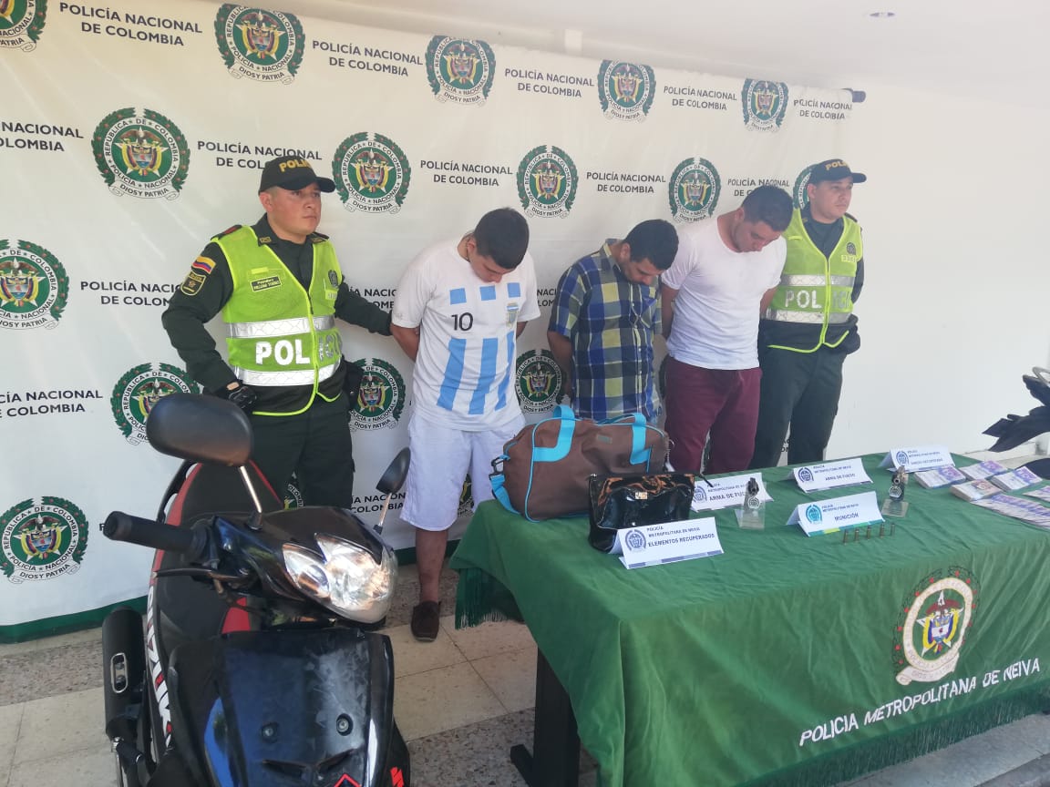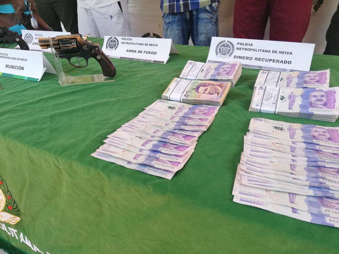 El ilícito se registró en el barrio Manzanares de Neiva, justo cuando una ciudadana se disponía tomar un taxi y viajar con la gruesa suma de dinero a otra ciudad del país; siendo abordada e intimidada por varios sujetos con armas de fuego quienes le hurtaron un bolso con $20 millones de pesos en efectivo. Ante las voces de auxilio de la víctima, Patrullero de los cuadrantes 54 y adscrito al CAI Timanco, iniciaron una persecución por las calles del sur de la capital opita logrando dar con la captura de los tres sospechosos en un inmueble ubicado en el barrio Limonar de Neiva.