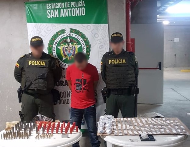 De igual forma en otro procedimiento realizado en el corregimiento de San Antonio de Prado, barrio El Limonar II, unidades de Policía del cuadrante mediante registro a personas ubicaron en vía pública a un hombre de 33 años de edad, a quien le fueron hallados un revolver calibre 38 con cinco cartuchos para el mismo, 50 cartuchos calibre 5,56, 49 cartuchos calibre 12 (para escopeta), 12 cartuchos calibre 9 milímetros, 46 cartuchos calibre 22 y 1200 papeletas de base de Coca. La persona capturada fue dejada a disposición de las autoridades competentes por los delitos de tráfico, fabricación y/o porte de armas de fuego, municiones y porte ilegal de sustancias estupefacientes.