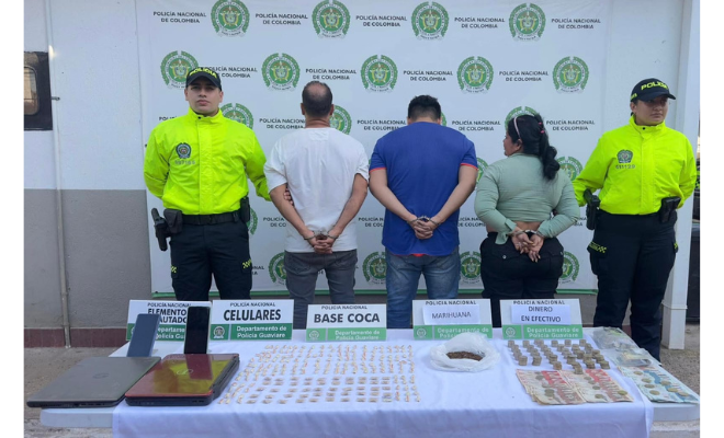 La Policía Nacional, a través de la Seccional de Investigación Criminal, logró la captura en flagrancia de tres personas de 28, 36 y 45 años de edad, por el delito de tráfico, fabricación o porte de estupefacientes, en el barrio El Arazá.