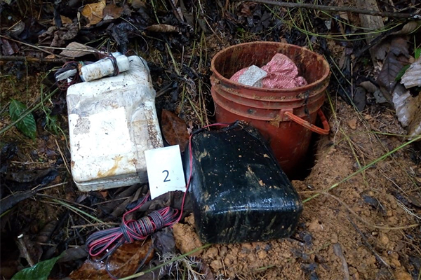 En desarrollo del Plan de Choque ‘El que la hace la paga’, Construyendo Seguridad, la Policía Nacional a través de la Dirección de Investigación Criminal e INTERPOL “DIJIN”, en coordinación con la Fiscalía General de la Nación, logró la ubicación y destrucción en la vereda El Morrón del municipio de Briceño (Antioquia), de 81 kilos de explosivo Amonal perteneciente al Grupo Armado Organizado Residual ‘Estructura 36’.